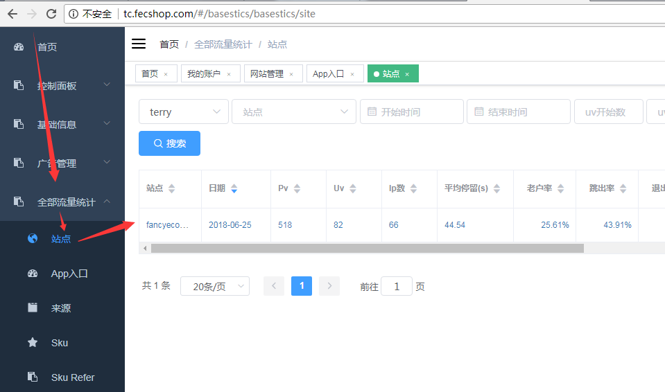 你的域名1:tc1.fecshop.com , 将这个域名解析到上面的ip,这个域名作为统计系统界面部分,也就是访问vue展示部分的域名